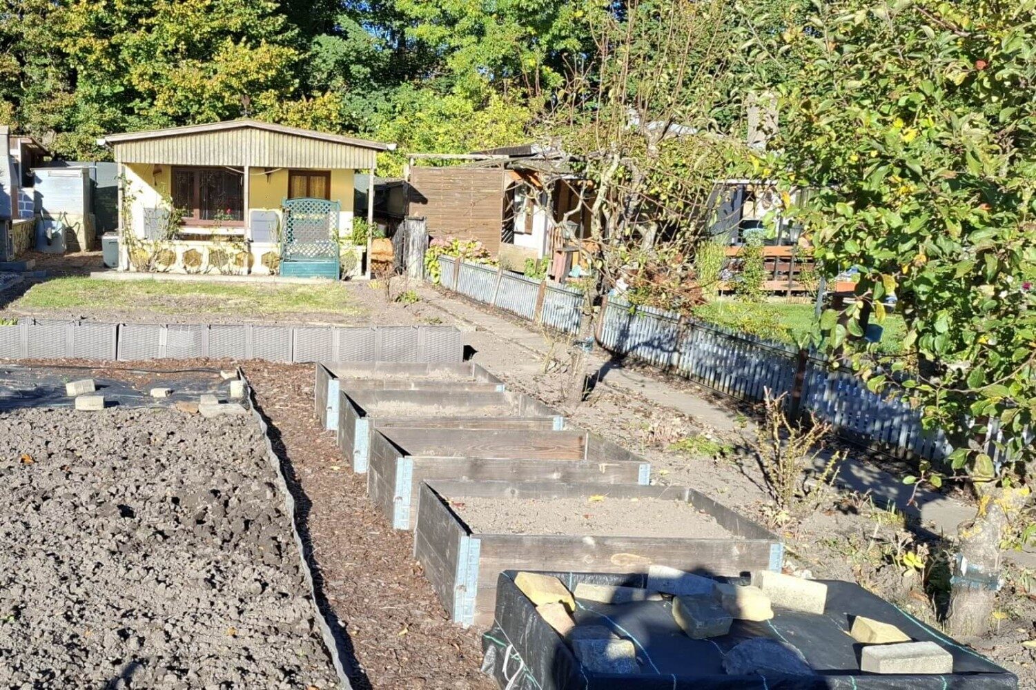 Ein gemütlicher Garten mit viel Potenzial: Obstgehölze, eine kleine Rasenfläche und Hochbeete laden zum Gärtnern und Entspannen ein. Die Laube wurde vor Kurzem innen mit Holz verkleidet und bietet Platz für gemütliche Stunden – ob allein oder mit Familie. Mit etwas Liebe entsteht hier schnell Ihr ganz persönliches Gartenparadies.